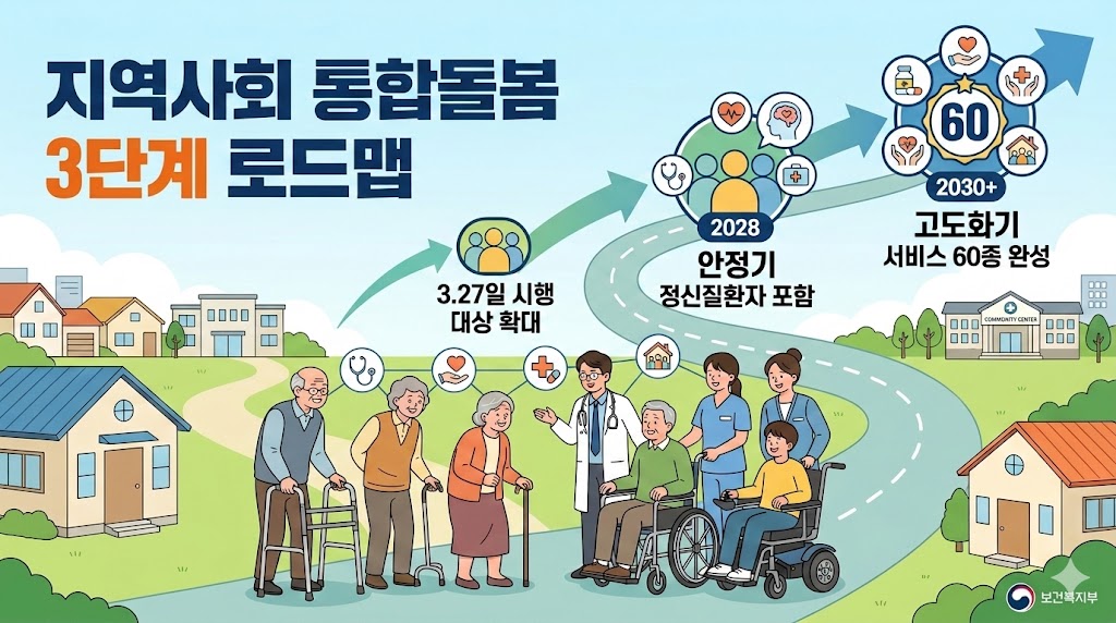 [메디칼타임즈=임수민 기자] 오는 3월 27일부터 노인과 장애인이 병원이나 시설 대신 살던 집에서 맞춤형 의료·요양 서비스를 받는 '지역사회 통합돌봄'이 전국적으로 시행된다.보건복지부(장관 정은경)는 5일 정부서울청사에서 제3차 '통합돌봄정책위원회'를 개최하고, 지역사회 통합돌봄 추진 로드맵 등을 논의했다.지역사회 통합돌봄제도는 고령화 심화와 복합적 돌봄수요 증가에 대응하여, 기존에 분절적으로 제공되던 의료·요양 등 돌봄서비스를 통합적으로 연계하기 위해 도입됐다. 그간 시범사업을 통한 준비과정을 거쳐 오는 3.27일 전국적으로 시행될 예정이다. 의료·요양 등 돌봄서비스를 통합적으로 연계하기 위한 통합돌봄이 오는 27일부터 시행된다.이번 로드맵은 제도 시행 전 정책 추진 방향을 공유하기 위해 마련됐으며, 도입기(2026~2027), 안정기(2028~2029), 고도화기(2030~) 등 3단계로 구분해 대상자 확대, 서비스 확충, 제도 기반 강화 방안을 제시하고 있다.지역사회 통합돌봄 대상자는 노인, 고령 장애인, 65세 미만 의료필요도가 높은 심한 장애인(지체, 뇌병변 등)으로 시작한다.2단계부터는 중증 정신질환자로 확대하며 모든 장애인으로 확대하는 방안도 검토한다. 또한 돌봄 필요도가 높은 대상자 유형을 분석하여 3단계에서 추가 확대할 예정이다.1단계에는 4개 분야(보건의료, 건강관리, 장기요양, 일상생활돌봄) 30종 서비스를 중심으로 연계한다.우선, 방문진료, 치매관리, 만성질환 및 정신건강관리, 퇴원환자 지원 등 재가 의료서비스를 확대한다.또한 스마트 기기를 활용한 방문건강, 노인 장애인 체육활동지원, 장애인 지역사회 중심재활사업 등 종합적인 건강관리 서비스를 제공한다.보건복지부(장관 정은경)는 5일 정부서울청사에서 제3차 '통합돌봄정책위원회'를 개최하고 향후 로드맵을 발표했다.이외에도 방문간호, 방문요양, 방문목욕 이용한도를 확대하고, 주야간 보호기관 내 단기보호 요양서비스를 확충한다. 동시에 재택의료센터를 통해 의료서비스 접근성을 높인다. 넷째, 긴급돌봄, 응급안전관리, 주거지원 등 일상생활지원도 강화한다.2단계에서는 방문재활, 방문영양, 병원동행, 통합재택간호 등 신규서비스를 시범사업(1단계)을 토대로 본격 제도화하고 임종케어 시범사업을 추진한다. 또한, 정신질환자 통합돌봄 실시에 따른 정신재활시설 및 쉼터 등 지역사회 지원기반을 구축한다. 3단계에서는 노쇠예방부터 임종케어까지 전주기 서비스 지원체계를 구축하여 서비스의 완성도를 높이고, 신규 서비스도 지속 확충하여 다양성도 확보한다. 이에 따라 1단계 30종 서비스에서 30종이 확대되어 총 60종 서비스를 제공할 계획이다.■ 중앙-지방 협력체계 구축 및 전담인력 역량 강화 추진제도적인 면에서는 1단계에서 통합돌봄 운영기반을 확충할 계획이다. 중앙정부 추진체계, 중앙-지방간 협력체계를 구축하고, 기본계획(중앙)과 지역계획(지방)을 연계하여 수립한다.또한 지역사회에서는 통합지원협의체를 중심으로 지자체, 전문기관, 제공기관 간 협력체계를 강화한다. 이와 함께, 전담인력 및 제공기관 대상 교육을 통해 역량을 강화한다.끝으로 사회적 입원·입소 감소율 등 평가지표를 통해 성과에 연동하여 예산을 지원하고, 정보연계시스템을 구축하여 통합돌봄 운영 효율성을 제고한다.2단계에서는 방문간호, 방문재활 등 다직역 서비스가 원활하게 작동할 수 있도록 법·제도를 정비한다. 또한 통합돌봄 서비스를 보다 편리하게 이용할 수 있도록 서비스 신청절차 및 제공방법도 개선한다.우선, 조사를 통해 대상자의 욕구를 파악한다. 이전에는 대상자가 자신에게 필요한 서비스를 정확히 알지 못했다면, 이제는 통합돌봄을 신청하면 시군구에서 수요자의 욕구와 의료, 요양 등 돌봄 필요도를 한 번에 조사해 파악한다.끝으로 3단계에서는 현재 건강보험, 장기요양보험, 예산 등으로 나누어진 돌봄 재정의 중장기적 구조혁신 방안을 검토하고, 유사·중복성이 높은 중앙 및 지자체 돌봄사업을 정비하는 등 서비스 전달체계를 정교화한다.이러한 지역사회 통합돌봄의 단계적 추진을 통해 대상자는 살던 곳에서 맞춤형 돌봄서비스를 제공받고 가족의 돌봄부담이 완화될 것으로 기대한다. 특히, 평가지표를 활용한 성과 기반 예산체계 도입하여 지역사회가 주도적으로 통합돌봄체계 구축하고, 사회적 입원‧입소를 줄이는 기반을 마련하여 사회보장제도의 지속가능성도 높일 전망이다.정은경 보건복지부장관은 "지역사회 통합돌봄은 일상생활에 어려움이 있는 국민이 살던 곳에서 건강하게 생활할 수 있도록 지원하는 핵심 제도"라며, "일본, 영국 등 주요 국가들도 10~20년에 걸쳐 제도를 성숙시켜온 것처럼 정부도 지속적인 보완 및 개선을 통해 국민이 체감할 수 있는 통합돌봄 체계로 발전시켜 나가겠다"고 덧붙였다.