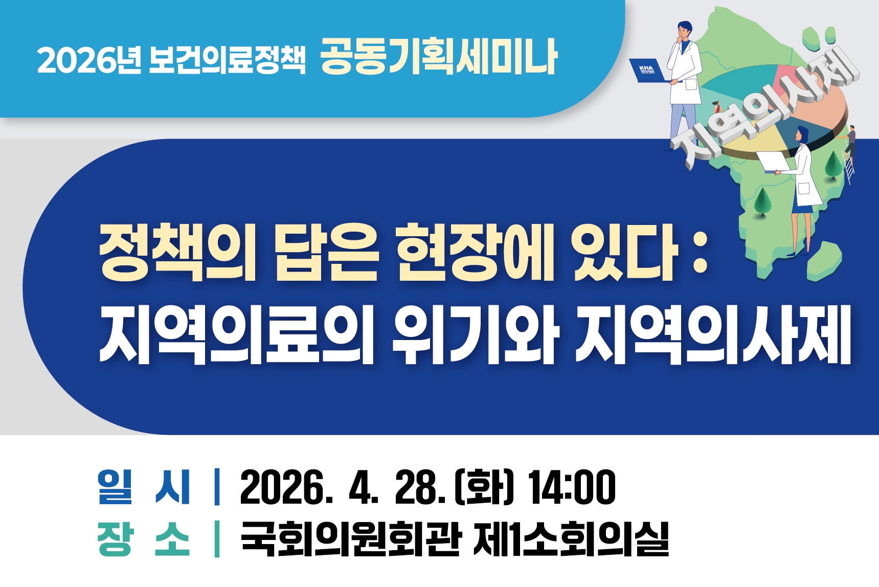 [메디칼타임즈=최선 기자] 대한의사협회가 오는 28일 오후 2시 국회의원회관 제1소회의실에서 국회 보건복지위원회 소병훈 위원장, 이수진 간사, 김윤 의원, 서미화 의원과 뜻을 모아 '2026년 보건의료정책 공동기획세미나'를 개최한다.'정책의 답은 현장에 있다: 지역의료의 위기와 지역의사제'를 주제로 열리는 이번 세미나는 소병훈 국회 보건복지위원회 위원장을 비롯해 4개 국회의원실이 공동으로 주최하고 대한의사협회와 한국정책학회(이석환 회장), 한국지방자치학회(이향수 회장)가 공동 주관한다. 입법부와 의료계, 주요 학회가 힘을 합쳐 코로나19와 의정 사태 등을 겪으며 심화된 지역 간 의료 접근성 격차와 필수·공공의료의 구조적 위기를 진단하고, 현장이 체감할 수 있는 실효성 있는 대안을 모색하기 위해 마련됐다.최근 정부는 지역의료 문제 해결을 위한 핵심 대안으로 '지역의사제'를 제안하고, 의과대학 정원 배정 등을 통해 정책적으로 추진하고 있다. 그러나 의료계는 해당 제도가 단순히 인력 배치의 문제를 넘어 직업 선택의 자유, 중앙정부와 지방자치단체 간의 역할 분담, 지방자치와 균형 발전 등 복합적인 정책 쟁점을 내포하고 있다고 지적해왔다.대한의사협회 김택우 회장은 "법안과 정책을 다루는 국회 보건복지위원회 주요 국회의원들과 함께 이번 세미나를 주최하게 돼 매우 뜻깊다"며 "지역의사제가 본격적으로 시행되기 전에 발생할 수 있는 집행 단계의 불확실성을 최소화하기 위해 국회와 현장이 함께하는 진지한 사회적 논의가 선행돼야 한다"고 세미나 개최의 배경을 설명했다.공동주관 기관인 한국정책학회 이석환 회장은 "지역의사제가 제대로 운영되기 위해 지역의료의 현재 상황분석과 함께 지방 및 중앙정부 의료계와 학계가 상호 유기적으로 이해될 수 있는 소통의 장이 되기를 바란다"라고 전했다. 한국지방자치학회 이향수 회장 또한 이번 세미나를 통해 지역의료의 위기에 대한 입체적 진단과 합의를 위한 대안이 도출되길 바란다고 언급했다.이번 세미나를 통해 입법부, 학계, 의료계, 그리고 중앙정부 및 지방자치단체는 지역의사제를 둘러싼 주요 쟁점을 종합적으로 검토하고 공론의 장을 통해 상호 소통을 촉진할 계획이다.세미나는 주제발표와 패널토의로 나뉘어 진행된다. 제1발제는 대한의사협회 의료정책연구원 김계현 연구위원이 '지역의사제 정착을 위한 제언'을 주제로 발표하며, 제2발제는 한국정책학회 주상현 지역부회장과 한국자치행정학회 정준호 회장이 '지역의사제의 지속가능성 확보를 위한 정책방향'을 제시할 예정이다.패널토의에서는 가톨릭관동대학교 주효진 교수가 좌장을 맡고 ▲김대연 태백병원장 ▲우병준 대한공중보건의사협의회 정책이사 ▲이현 한국지방자치학회 연구부회장 ▲이승혁 한국정책학회 연구위원회 위원장 ▲이혜인 경향신문 기자 ▲방영식 보건복지부 의료인력정책과장 등 각계 전문가들이 참석해 심도 있는 종합 토론을 펼친다.