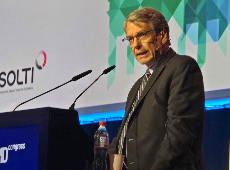 찰스 게이어(Charles Geyer) 미국 피츠버그의대 교수가 엔허투 DESTINY-Breast05 임상 결과를 ESMO 2025에서 발표하고 있다.