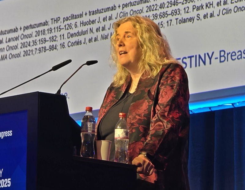 나디아 하벡(Nadia Harbeck) 독일 뮌헨 LMU 대학병원 교수가 엔허투 DESTINY-Breast11 결과를 ESMO 2025에서 발표하고 있다.
