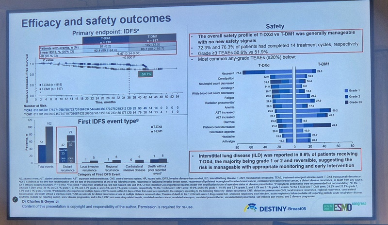 발표를 맡은 찰스 게이어(Charles Geyer) 미국 피츠버그의대 교수는 "재발 위험이 높은 고위험군 환자에서 T-DXD 치료가 표준 치료인 T-DM1에 비해 임상 및 통계적으로 IDFS의 유의미한 개선을 이끌어낸다는 것을 확인했다"며 "잔류 침습성 질환을 가진 환자들에게 표준 보조제인 T-DM1보다 더 효과적이었다. 이는 잠재적인 새로운 표준 치료의 등장을 나타낸다"고 강조했다.