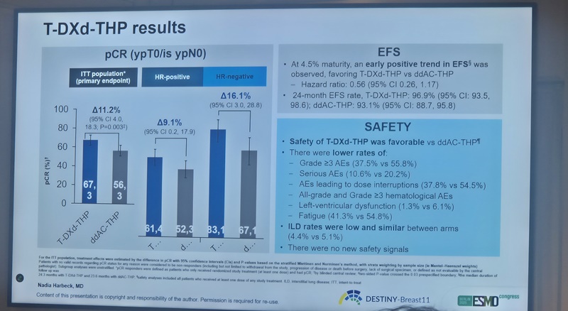 그 결과, 해당 임상 결과, 병리학적 완전관해율(pathology Complete Response, pCR)은 T-DXD-THP 병용군이 67.3%, 표준 치료(용량집중 독소루비신, 시클로포스파미드 투여 후 THP 병용요법 투여(ddAC-THP)군이 56.3%로, 양 군 간에 통계적으로 유의한 차이를 보였다(p=0.003). 또 무사건 생존률(Event-Free Survival, EFS)에서도 개선 경향이 관찰됐다.