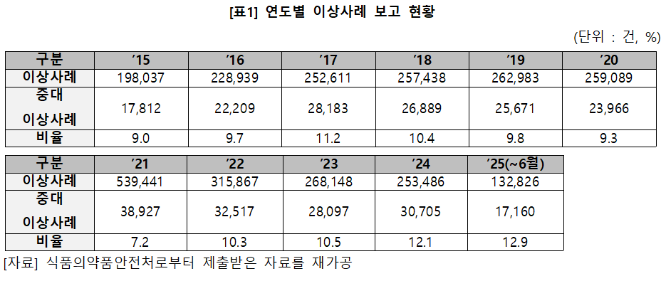 이 가운데 '중대 이상사례'가 29만 2136건으로 전체 이상사례의 9.8%에 달했다. 특히 '중대 이상사례' 비율은 올해 12.9%로 최근 11년 중 최대치로 나타났다.