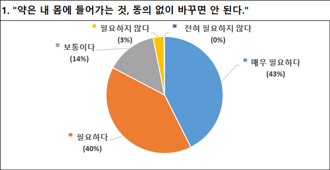 이 설문에서 응답자의 83%는 필수적인 동의 절차를 요구했다. 의약품은 환자의 몸에 들어가는 것인 만큼. 동의 없이 바꾸면 안 된다는 지적이다. 설명 없이 바뀌는 것에 불안감이 큰 모습이다.