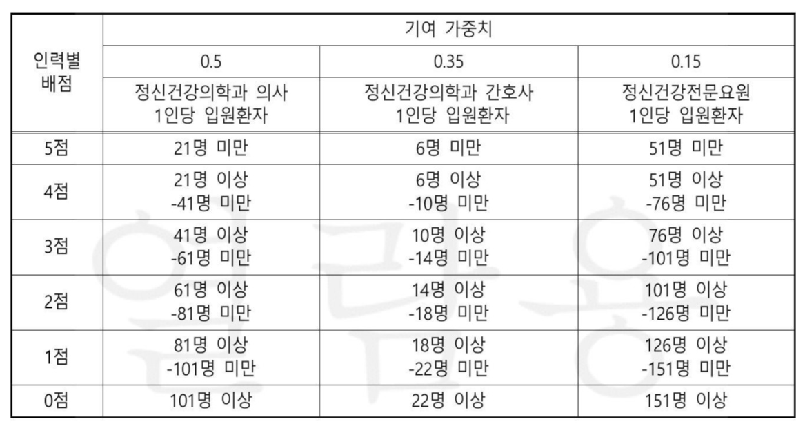 보건복지부 고시에 따르면 정신건강의학과 의사인력은 요양기관 현황 신고서상 신고된 전문의 및 레지던트를 기준으로 하고, 간호인력은 정신건강의학과 입원병동, 낮병동, 외래병동에 배치돼 실제 환자간호를 전담하는 간호사와 간호조무사를 의미한다.