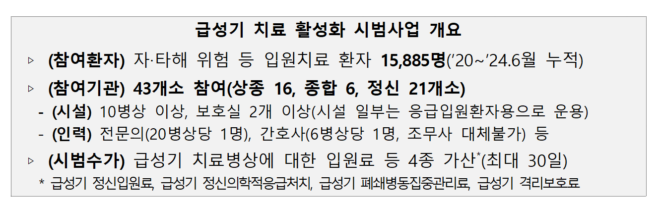 동 제도는 급성기 치료 활성화 시범사업의 본사업화 방안으로 도입하며, 그간 ▲법적 근거 마련 ▲강화된 인력·시설기준 마련 ▲급성기 정신질환 집중치료실 입원료 신설 등 보상 강화 등을 추진했다.