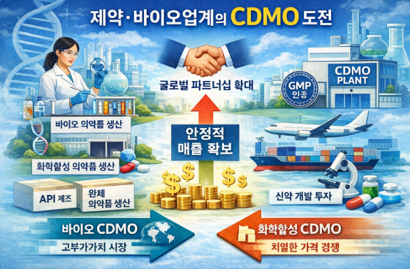 국내 제약·바이오 업계가 CDMO(위탁개발·위탁생산)를 새로운 성장 동력으로 적극 육성하고 있다. 바이오의약품 분야를 넘어 화학합성 의약품, API(원료의약품), 완제의약품을 생산하는 전통 제약사들까지 CDMO 사업 강화에 나서면서, CDMO는 제약업계 전반의 중장기 전략 일환으로 자리잡고 있다.
