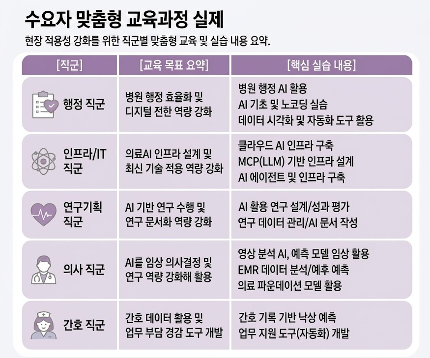 이를 위해 의사, 간호사, 의료기사, 행정직 등 각 직군이 실제 업무에서 AI를 어떻게 활용해야 하는지 정의한 역량 모델 기반 5단계 교육 체계를 수립했다.