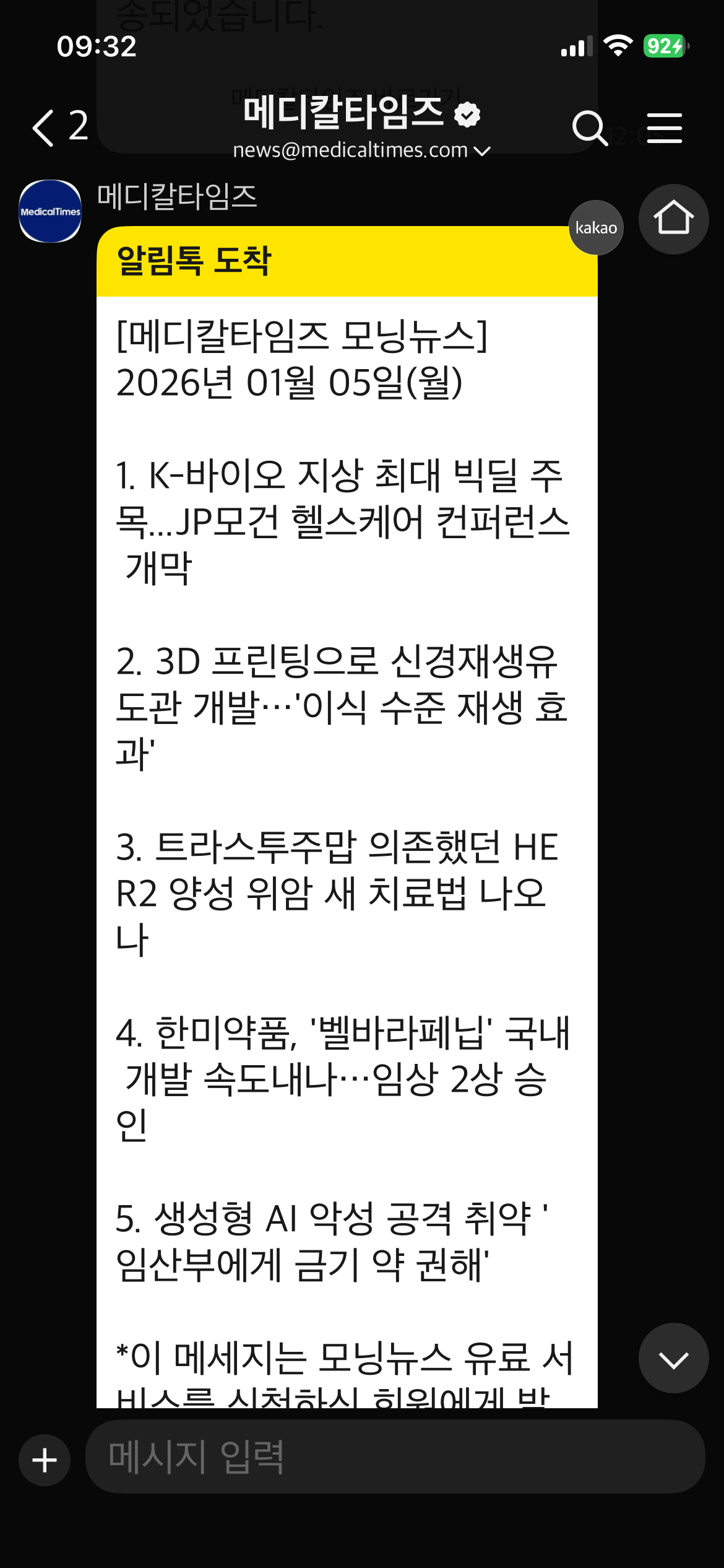 보건의료분야를 대표하는 메디칼타임즈가 2026년 1월부터 카카오톡 형태의 모닝뉴스를 시작했습니다.