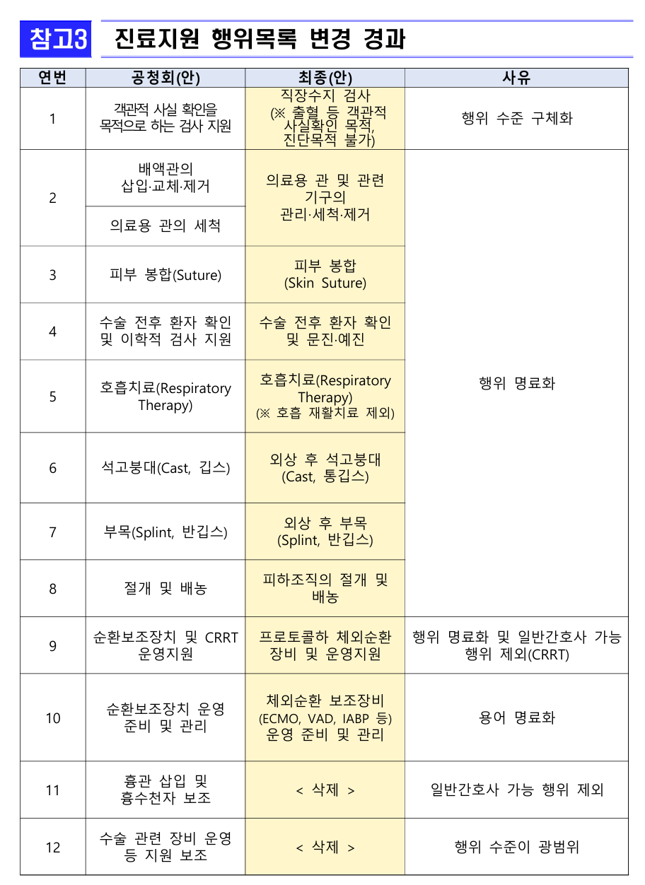 삭제된 행위는 '흉관 삽입 및 흉수천자 보조' 및 '수술 관련 장비 운영 등 지원 보조' 등이다. 전자의 경우 일반간호사 가능 행위라 제외됐으며, 후자는 행위 수준이 광범위해 삭제됐다.