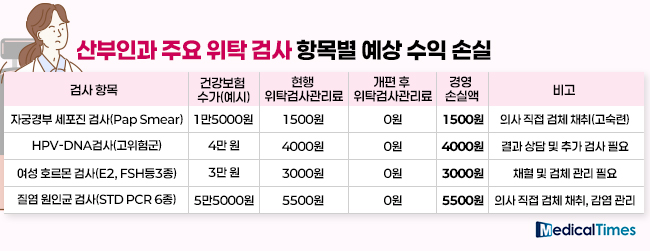 산부인과의사회는 이로 인해 검사량이 최소 50%에서 최대 10분의 1까지 줄어들 수 있다고 전망했다. 이 때문에 환자는 기초적인 검사라도 대형병원에서 받아야 하며, 종별 가산으로 20%의 검사비를 추가로 부담해야 한다는 우려다.
