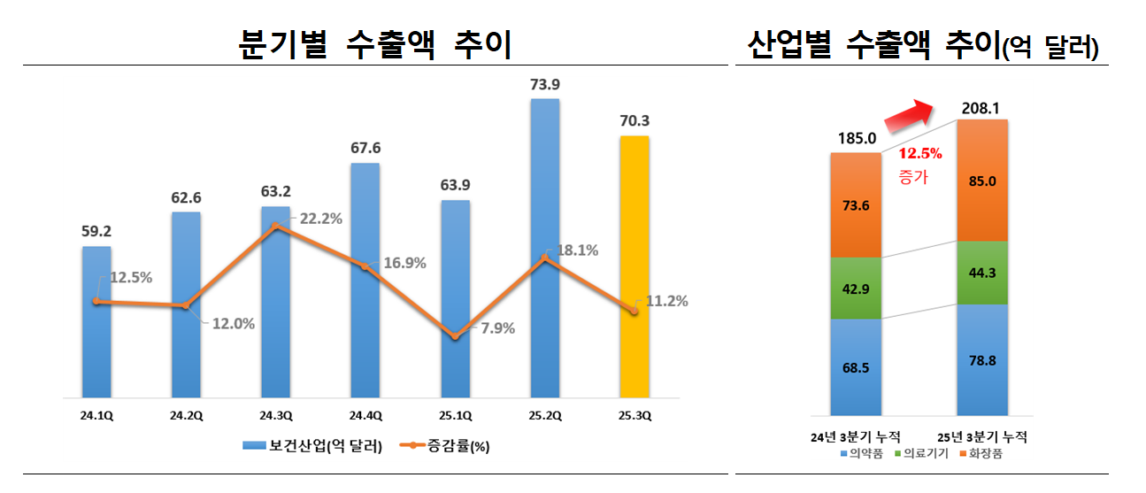 올해 3분기 누적 보건산업 수출액은 지난해 같은 기간보다 12.5% 증가한 208억1000만달러를 기록했다. 분야별로는 화장품 85억 달러(+15.4%), 의약품 78억8000만달러(+15.1%), 의료기기 44억3000만달러(+3.3%) 순으로 수출 실적이 높게 나타났다.