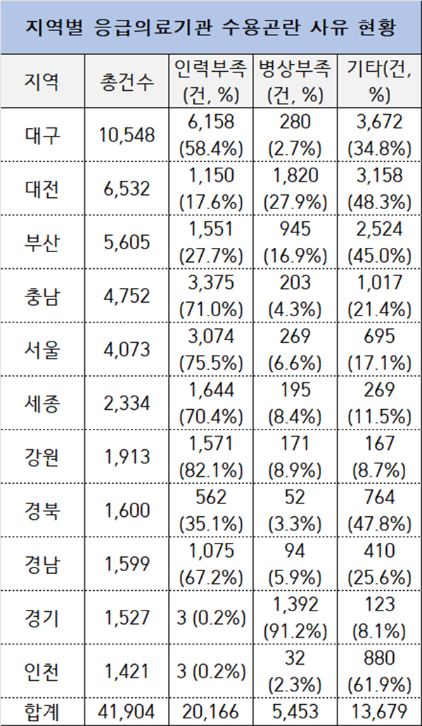 2024년 수용곤란 고지건수 기준 상위 20개 응급의료기관의 수용곤란 고지건수는 총 4만1904건을 기록했다. 인력부족이 2만166건으로 48.1%를 기록했으며 기타가 32.6%(1만3679), 병상부족 13%(5453건)이었다.