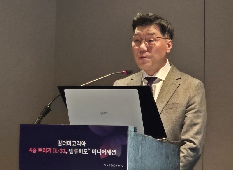 [메디칼타임즈=문성호 기자]아토피 피부염과 결절성 가려움 발진(양진) 치료 시장에 '가려움증의 핵심 경로'를 직접 타격하는 새로운 기전의 생물학적 제제가 임상현장에 등장했다.이미 듀피젠트(두필루맙, 사노피) 등 기존 치료제들이 시장을 선점한 상황에서, '가려움증 조기 완화'와 '투여 편의성'을 무기로 내세운 넴루비오가 임상 현장의 미충족 수요를 파고들 수 있을지 관심이 쏠린다.갈더마코리아 이재혁 대표이사가 생물학적 제제 '넴루비오'의 임상적 가치와 향후 출시 전략을 발표하고 있다.갈더마코리아는 13일 더 플라자 호텔에서 미디어 세션을 열고, 지난 1월 식품의약품안전처로부터 허가받은 IL-31 수용체 차단 생물학적 제제 '넴루비오(네몰리주맙)'의 임상적 가치와 향후 전략을 발표했다."단 48시간 만에 가려움 완화"…IL-31 직접 차단이날 연자로 나선 가톨릭대 은평성모병원 김정은 교수(피부과)는 아토피와 결절성 양진 환자들이 겪는 '가려움-긁기(Itch-Scratch)' 악순환의 핵심 인자로 인터루킨-31(IL-31)을 지목했다.김정은 교수는 "IL-31은 감각 신경을 직접 자극해 가려움 신호를 전달하고 피부 섬유화까지 관여하는 '4중 트리거' 역할을 한다"며 "넴루비오는 이를 선택적으로 차단해 투여 48시간 이내에 통계적으로 유의한 가려움 완화 효과를 보였다"고 말했다.이번 세션에서 강조된 넴루비오의 가장 큰 강점은 '빠른 효과'다. 넴루비오는 아토피 피부염 및 결절성 가려움 발진 환자 모두에서 투여 48시간 이내에 위약군 대비 통계적으로 유의한 가려움 완화 효과를 입증했다.주요 임상 연구인 ARCADIA 1·2(아토피)에 따르면, 넴루비오 투여군의 EASI-75(습진 면적 및 중증도 지수 75% 개선) 달성률은 각각 43.5%, 42.1%로 위약군(29%, 30.2%) 대비 유의하게 높았다. 특히 가려움 중증도는 기저치 대비 56% 감소했으며, 위약군 대비 2배 이상의 환자가 임상적으로 의미 있는 가려움 완화를 경험했다. 또한 OLYMPIA 1·2(결절성 양진) 연구에서는 16주 차 가려움 완화 반응률이 최대 58.4%에 달해 위약군(16.7%)을 압도했다. 또한 피부 병변의 깨끗함(IGA 0/1)을 달성한 환자가 위약군 대비 3배 이상 많았고, 수면 장애도 약 61% 개선되는 결과를 보였다.은평성모병원 김정은 교수는 아토피와 결절성 양진 환자들이 겪는 '가려움-긁기(Itch-Scratch)' 악순환의 핵심 인자로 인터루킨-31(IL-31)을 지목했다.장기 치료 데이터 역시 긍정적이다. 최대 104주에 걸친 장기 연장 연구(LTE) 중간 분석 결과, 피부 병변과 가려움, 수면의 질 개선 효과가 2년 이상 일관되게 유지됐으며 새로운 이상반응은 관찰되지 않았다.김정은 교수는 "환자들이 겪는 가려움과 긁기의 악순환은 전신적인 고통으로 이어진다"며 "넴루비오는 장기 치료에서도 일관된 효과와 안전성을 확인한 만큼, 상대적으로 초기부터 가려움을 잡으면서도 안정적인 치료를 이어갈 수 있는 기회를 제공한다"고 설명했다.치열한 치료제 경쟁…'급여' 시장 안착 관건현재 국내 아토피 치료제 시장은 듀피젠트를 필두로 아트랄자(트랄로키누맙, 레오파마), 엡글리스(레브리키주맙, 릴리) 등 다양한 생물학적 제제들이 급여권 내에서 경쟁하고 있다. 넴루비오가 후발 주자로서 입지를 다지기 위해서는 결국 '급여 진입'과 '처방 편의성'이 승부처가 될 전망이다.이를 모를리 없는 갈더마코리아도 적극적인 급여 전략을 취하고 있다. 건강보험심사평가원에 현재 식약처에 허가된 두 적응증 모두 급여 신청을 완료한 상태다.갈더마코리아는 넴루비오의 강력한 가려움증 개선 효과 외에도 유지 용법 시 '8주 간격 투여'가 가능하다는 점을 임상 현장의 큰 장점으로 내세울 것으로 보인다. 이는 환자의 병원 방문 횟수를 줄여 순응도를 높이는 핵심 요소가 될 수 있다. 갈더마코리아 이재혁 대표이사는 "넴루비오는 기존 치료에 한계가 있었던 환자들에게 새로운 패러다임을 제시할 것"이라며 "현재 보험급여 등재 신청을 완료했으며, 2026년 하반기 국내 출시를 목표로 후속 절차에 박차를 가하고 있다"고 밝혔다.