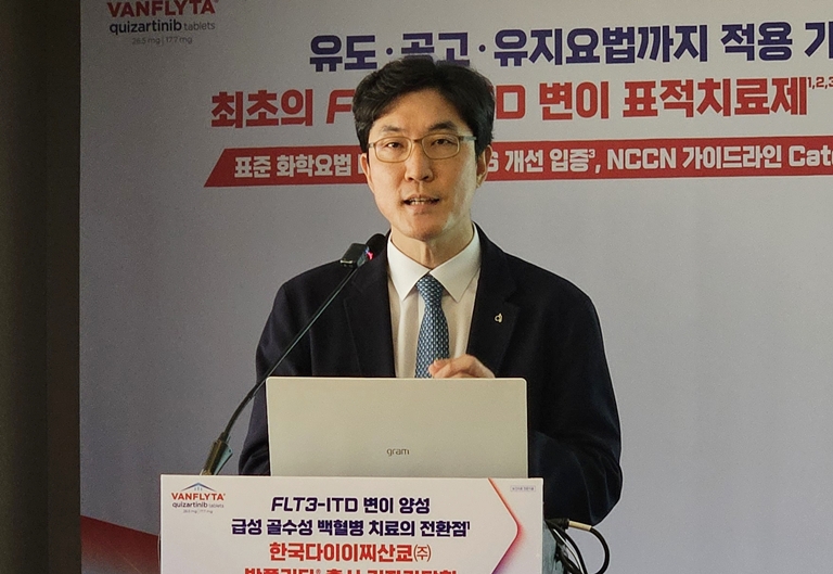 [메디칼타임즈=허성규 기자] 높은 재발 위험과 불량한 예후를 보이는 FLT3-ITD 변이 양성 급성 골수성 백혈병 환자를 위한 새 옵션이 등장했다.특히 유도·공고·공고 후 유지요법까지 가능한 반플리타는 실제 임상을 통해 전체 생존기간 연장 및 재발률 감소, 완전 관해 지속기간 연장을 확인해 임상 현장의 기대을 모으고 있다.서울성모병원 조병식 교수는 FLT3-ITD 변이 AML 환자의 미충족수요가 여전히 높다는 점을 설명했다. 14일 한국다이이찌산쿄는 급성 골수성 백혈병(Acute Myeloid Leukemia, AML) 표적치료제 반플리타(성분명: 퀴자티닙염산염) 출시 기념 간담회를 개최했다.반플리타는 지난 1월 'FLT3-ITD 변이 양성인 새로 진단받은 급성 골수성 백혈병 성인 환자의 표준 시타라빈 및 안트라사이클린 유도요법과 표준 시타라빈 공고요법과의 병용 및 공고요법 후 단독 유지요법'으로 국내 허가를 획득했다.이에 이날 간담회에서는 서울성모병원 혈액내과 조병식 교수와 서울대학교병원 혈액종양내과 신동엽 교수가 연자로 나서 AML과 FLT3-ITD 변이 양성 환자의 치료 부담을 조명하고, QuANTUM-First 연구 결과를 통해 반플리타의 임상적 가치를 공유했다.FLT3-ITD 변이, 여전히 재발 위험 높아…미충족 수요 커우선 서울성모병원 조병식 교수는 '급성 골수성 백혈병(AML)과 FLT3-ITD 변이'를 주제로, FLT3-ITD 변이의 병태 생리와 임상적 의미에 대해 전달했다.우선 조병식 교수는 "AML은 빠르게 진행하는 혈액암으로 치료 과정에서도 유전적 변화가 지속적으로 발생할 수 있다"며, "이는 유전적 이질성이 큰 질환으로 분자 진단 결과는 치료 전략 수립과 예후 평가에 중요한 영향을 미친다"고 소개했다.또한 FLT3는 조혈모세포의 생존, 증식 및 분화를 조절하는 핵심적인 역할을 하는 수용체지만, 특정 변이가 발생할 경우 암세포의 발생 경로를 활성화해 AML 세포의 성장을 촉진한다는 점을 언급했다.조병식 교수는 "FLT3-ITD 변이 양성은 예후가 불량한 아형으로, 새로 진단된 환자의 약 25%에서 발생한다"며 "AML 환자 대상 대규모 데이터에서 FLT3-ITD 변이 부담이 50%를 초과하는 환자는 관해 후 5년 내 재발률이 82%, 5년 전체 생존율 15%로 예후가 매우 불량한 것으로 나타났다"고 설명했다.특히 2017년 이후 다양한 표적치료제의 등장으로 치료 패러다임이 변화함에도 불구하고 여전히 미충족 수요가 크다는 점을 강조했다.조 교수는 "FLT3 저해제의 등장으로 치료 패러다임이 발전함에도 불구하고, FLT3 변이 양성 AML은 기존 FLT3 저해제와 화학요법 병용 시 2년 누적 재발률이 약 40%에 달하는 것으로 관찰된다"며 "이중에서 다수를 차지하고 예후가 불량한 FLT3-ITD 변이 양성 AML 환자의 예후를 개선할 수 있는 새로운 치료 옵션에 대한 미충족 수요가 높은 상황"이라고 강조했다.서울대병원 신동엽 교수는 반플리타의 임상 결과를 통해 전주기에서 생존 혜택을 입증했다는 점을 강조했다. '반플리타' 전주기 치료에서 생존 개선 등 효과 확인이어 두 번째 연자로 나선 서울대병원 신동엽 교수는 'QuANTUM-First 연구의 의의와 반플리타®의 임상 혜택'에 대해 발표했다.이날 신동엽 교수는 반플리타는 새로 진단된 FLT3-ITD 변이 양성 성인 AML 환자를 위한 새로운 표적 치료제라고 소개했다.이는 공격적인 AML 아형인 FLT3-ITD 변이를 선택적으로 표적하며, 유도, 공고, 공고 후 유지요법까지 가능한 국내 유일한 AML 치료 옵션이라는 점을 언급했다.실제로 QuANTUM-First 연구는 새로 진단된 FLT3-ITD 양성 AML 환자를 대상으로 유도요법부터 유지요법까지 치료 전 과정에 걸쳐 반플리타의 생존 혜택을 입증한 연구라는 설명이다.QuANTUM-First 연구 결과에 따르면, 새로 진단된 FLT3-ITD 변이 양성 성인 AML 환자(18-75세)를 대상으로 반플리타 투여군(n=268)은 위약군(n=271) 대비 사망 위험이 22% 감소했다(HR=0.78, 95% CI: 0.62-0.98; p=0.032).또한 완전 관해(CR)를 달성한 환자에서 CR 지속기간 중앙값은 반플리타 투여군은 38.6개월로 위약군 12.4개월 대비 3배 이상 연장되었으며(HR=0.62, 95% CI: 0.45-0.86), 누적 재발률(CIR)은 12개월 기준 반플리타 투여군 18.7%로 위약군 34.9%에 비해 낮았다.안전성과 관련해 가장 흔하게 발생한 3등급 또는 4등급 치료 관련 이상반응은 발열성 호중구감소증, 저칼륨혈증, 폐렴 등이었다. QT 간격 연장 관련 이상반응은 반플리타 투여군에서 더 빈번하게 관찰됐다.신동엽 교수는 "FLT3-ITD 양성 AML 환자에서 반플리타+Standard CT 병용요법군은 위약+Standard CT 병용요법군 대비 전체 생존기간(OS)를 유의하게 연장시켰다"며 "재발률 감소, 무병생존(RFS) 및 MRD negativity에서 유의한 개선을 나타냈다"고 덧붙였다.