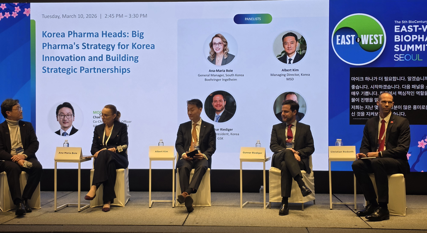 [메디칼타임즈=임수민 기자] 글로벌 제약업계가 한국을 단순한 매출 거점을 넘어 혁신 기술 소싱과 초기 임상의 핵심 기지로 재평가하고 있다.세계적인 제약사들의 한국 법인장들은 K-바이오가 글로벌 무대에서 살아남기 위해서는 개발 초기 단계부터 세계 시장을 겨냥한 전략적 설계가 필수적이라고 입을 모았다.10일 웨스틴 조선 호텔에서 '이스트웨스트 바이오파마 서밋 서울 2026'이 개최됐다.10일 웨스틴 조선 호텔에서 한국바이오협회 등이 개최한 '이스트웨스트 바이오파마 서밋 서울(East-West Biopharma Summit Seoul) 2026'에서 글로벌 제약사 수장들은 한국 내 역할 변화와 파트너링 전략을 집중 조망하는 패널 토론을 진행했다.이날 토론에는 ▲안나-마리아 보이(Ana-Maria Boie, 한국베링거인겔하임 총괄 매니저), ▲알버트 김(Albert Kim, 한국MSD 대표이사), ▲구나 리디거(Gunnar Riediger, 한국GSK 대표이사), ▲크리스찬 로드세스(Christian Rodseth, 존슨앤존슨 북아시아 총괄 이사) 등이 참석해 한국 바이오 생태계의 미래와 협력 방안을 논의했다.글로벌 제약사들은 한국 시장에서 각기 다른 질환군에 집중하면서도, 공통적으로 '환자의 미충족 수요(Unmet Needs)' 해결을 최우선 과제로 꼽았다.한국MSD 알버트 김 대표이사는 "MSD는 '바이올로지 퍼스트(Biology First)' 원칙에 따라 혁신을 추구한다"며 "항암 분야의 리더십을 유지하는 동시에 심혈관 대사, 백신, 면역학 등으로 포트폴리오를 적극적으로 다각화하고 있으며, 향후 5년 내 20개 이상의 신규 런칭을 준비 중"이라고 밝혔다.한국GSK 구나 리디거 대표이사는 "전통적인 강점인 항암과 호흡기 질환 외에도 HIV와 백신을 포함한 '감염병 예방' 영역에 집중하고 있다"며 "치료를 넘어선 예방 솔루션이 GSK가 추구하는 핵심 가치"라고 강조했다.이러한 전략적 집중은 한국의 우수한 임상 인프라와 결합되어 구체적인 성과로 나타나고 있다. 패널들은 특히 한국 내 임상 시험의 무게중심이 초기 단계로 이동하고 있다는 점에 주목했다.알버트 김 대표이사는 "과거에는 국내 허가를 위한 임상 3상 위주였다면, 현재 한국MSD 임상의 약 50%는 임상 1상과 2상"이라며 "이는 한국의 연구자들과 의료 커뮤니티의 전문성을 활용해 아주 초기 단계부터 약물을 개발하고 있다는 증거"라고 분석했다.존슨앤존슨 크리스찬 로드세스 총괄이사는 유한양행 및 레고켐바이오와의 협력을 언급하며 "한국의 혁신이 글로벌 시장으로 뻗어 나가는 가교 역할을 우리가 수행하고 있다"고 밝혔다.국내 바이오텍과 투자자들을 향해서는 개발 초기 단계부터 글로벌 관점을 견지해야 한다는 실질적인 조언이 이어졌다.한국베링거인겔하임 안나-마리아 보이 매니저는 "발견(Discovery) 단계부터 글로벌 경쟁자와 전 세계적인 수요를 고려한 엔드포인트(Endpoint)를 설정해야 한다"며 "글로벌 제약사와의 소통을 초기 단계부터 시작해 파트너십을 구축하는 것이 성공의 열쇠"라고 조언했다.투자 측면에서는 단기적인 성과보다 과학적 데이터에 기반한 인내심이 강조됐다.알버트 김 대표이사는 "과학과 데이터가 충분히 증명될 때까지 기다릴 수 있는 인내심이 필요하다"며 "단기적인 메가 딜에 매몰되기보다, 데이터의 신뢰성을 확보하는 데 집중해야 글로벌 시장의 선택을 받을 수 있다"고 제언했다.끝으로, 최근의 지정학적 상황이 한국 내 투자에 미치는 영향에 대해 패널들은 리스크보다 '예측 가능성'과 '안정성'에 더 큰 무게를 실었다.크리스찬 로드세스 총괄 이사는 "지정학적 변화는 불가피하지만, 우리의 목표는 변하지 않는다"며 "헬스케어에 대한 투자는 4배의 경제적 보답으로 돌아오는 기회인 만큼, 혁신에 대한 접근성을 개선하는 본질에 집중할 것"이라고 말했다.알버트 김 대표이사는 "개인적인 견해로 한국은 투자하기에 가장 안전한 국가 중 하나"라며 "정부 역시 혁신을 지지하고 있는 만큼, 지금이 투자의 적기"라고 강조했다.
