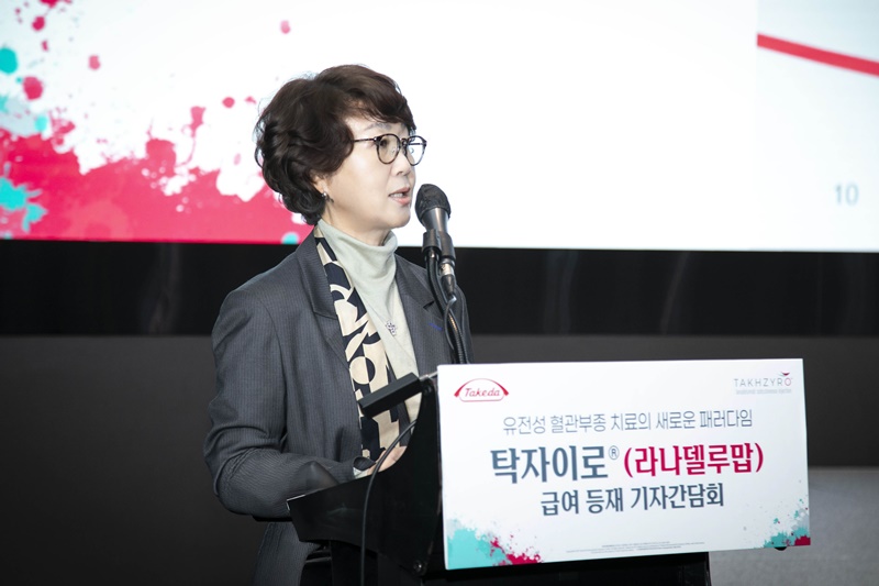 [메디칼타임즈=문성호 기자]국내 유전성 혈관부종(HAE) 치료 패러다임이 '사후 대응'에서 '사전 예방'으로 전환될 전망이다. 그간 치료 사각지대에 놓여있던 환자들이 고가의 약값 부담을 덜고 일상적인 예방 요법을 이어갈 수 있는 길이 열렸기 때문이다.이대목동병원 알레르기내과 조용주 교수.이대목동병원 조용주 교수(알레르기내과)는 25일 한국다케다제약이 개최한 기자단담회에 참석해 HAE 장기 예방 치료제 탁자이로(라나델루맙)의 건강보험 급여 등재에 따른 임상적 의미를 평가했다.여기서 HAE은 C1 에스터레이즈 억제제 결핍/기능 부전으로 인해 얼굴, 손발, 복부, 특히 기도에 반복적인 심한 부종이 발생하는 희귀 유전질환이다. 두드러기나 가려움증 없이 통증을 동반한 부종이 특징이며, 후두 부종 시 질식사 위험이 있다. 이 가운데 탁자이로는 HAE 증상의 일상적인 예방에 사용되는 치료제다. 이 약은 브라디키닌 생산을 유발하는 혈장 칼리크레인(pKal) 효소를 선택적으로 억제해 혈관부종을 예방하는 작용기전을 가진다. 탁자이로는 글로빌 임상3상 HELP 연구를 통해 효능과 안전성을 확인했다. 이 연구는 평균 월 3.7회 급성 부종을 겪은 1·2형 HAE 환자 125명을 대상으로 진행됐다.임상 결과, 탁자이로 300mg 2주 간격 투여군은 위약 대비 중증도·중증 급성 부종이 83%, 급성 치료가 급성 부종이 87% 감소했다. 또 HELP OLE 연장 연구에서 총 212명을 약 30개월 추적한 결과, 기저 시점 대비 평균 87.4% 급성 부종 감소 효과가 유지됐다. 장기 투영에서도 새로운 안전성 이슈는 보고되지 않았다. 조용주 교수는 "환자의 약 40%는 5세 이전, 75%는 15세 이전에 첫 급성 부종을 경험하지만 오진으로 인한 HAE 진단 지연 기간은 13.3년으로 보고된다"며 "현재 국내에서는 질환 인지 부족과 진단 지연 등의 이유로 실제 환자 규모가 확인되지 못하고 있는 상황"이라고 설명했다.그는 "진단 이후에도 급성 부종은 예측이 어렵고 반복적으로 발생해 환자들은 지속적인 불확실성과 생명 위협 속에서 생활하게 된다"며 "탁자이로는 최신의 장기 예방 치료제로 국내 급여 적용을 계기로 치료의 새로운 패러다임을 열 것"이라고 전망했다.이대목동병원 알레르기내과 조용주 교수.이에 따라 탁자이로에 설정된 급여 기준은 ▲남성호르몬 제제 '다나졸(Danazol)'을 6개월 이상 투여했는데도 최근 6개월 동안 월평균 3회 이상 피라지르(아세테이트) 투여를 요하는 발작이 발생한 경우 ▲다나졸 투여여가 금기 또는 부작용 등으로 투여할 수 없는 경우 동 약제 투여 이전 6개월 동안 월평균 3회 이상 응급 치료가 필요했던 경우에 인정된다. 다만, 임상현장에서는 급여 적용을 위한 기준은 다소 엄격하다는 평가다.특히 '다나졸(Danazol) 경구제를 6개월 이상 투여했음에도 최근 6개월간 월 평균 3회 이상 발작이 발생해야 한다'는 부분이다.결국 5년 만의 급여 등재로 '예방 요법'의 물꼬는 텄지만, 실질적인 환자 보장성 확대를 위해서는 향후 임상 데이터를 바탕으로 한 급여 기준의 유연한 개선이 필요할 것으로 예상된다.함께 자리한 이대서울병원 안경민 교수(알레르기내과)는 "현재 설정된 급여 기준을 임상 현장에서 충족시키기가 현실적으로 매우 타이트하다"고 꼬집었다.그는 "대표적으로 임신을 계획 중인 젊은 여성 환자의 경우, 기형 유발 위험이 있는 다나졸을 투약하기 어렵다"며 "급여기준상 다나졸 투약이 전제되지 않으면 환자들이 혜택을 보기 어려워 실제 임상 현장에서 활용하는 데 상당한 애로사항이 존재한다"고 덧붙였다.