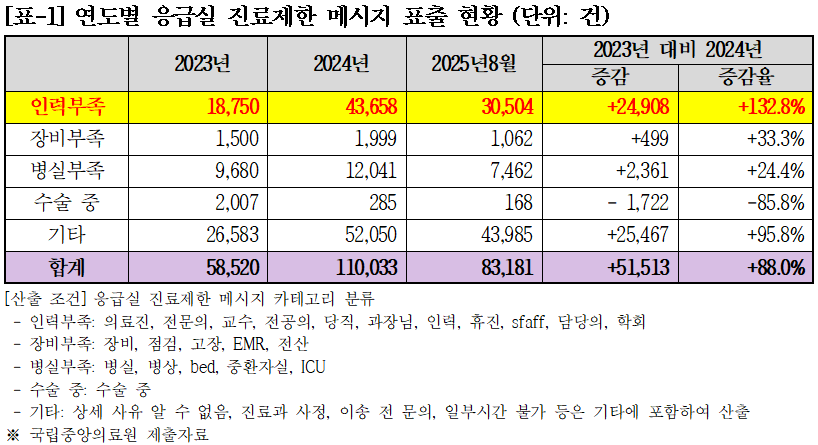 실제 조국혁신당 김선민 의원실이 발표한 자료에 따르면 지난해 중앙응급의료센터에 표출된 응급실 진료제한 메시지는 11만33건으로 나타났다. 이는 전년 5만 8520건 대비 88% 증가한 숫자다. 올해 8월까지만 해도 인력 부족을 이유로 한 응급실 진료 제한 메시지가 3만504건에 달했다.