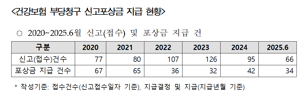 건강보험 부당청구 신고 건수는 2022년 107건에서 2023년 126건, 2024년 95건으로 감소 추세이며, 금년 상반기 66건으로 집계됐다.