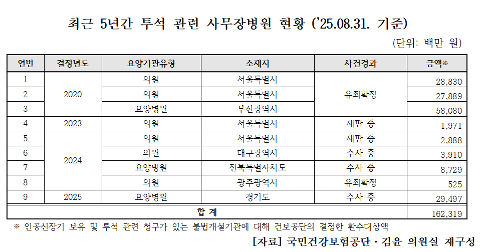 이후 2023년 19억원, 2024년 160 원, 2025년 294억원으로 최근 3년간 투석 관련 사무장병원의 불법 행태는 증가하고 있었다.