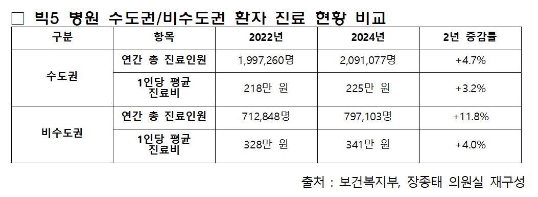 국회 보건복지위원회 소속 더불어민주당 장종태 국회의원(대전 서구갑)이 서울 주요 5개 상급종합병원(빅5 병원)의 진료 데이터를 분석한 결과, 비수도권 환자 수는 2022년 71만2848명에서 2024년 79만7103명으로 11.8% 증가한 것으로 나타났다.
