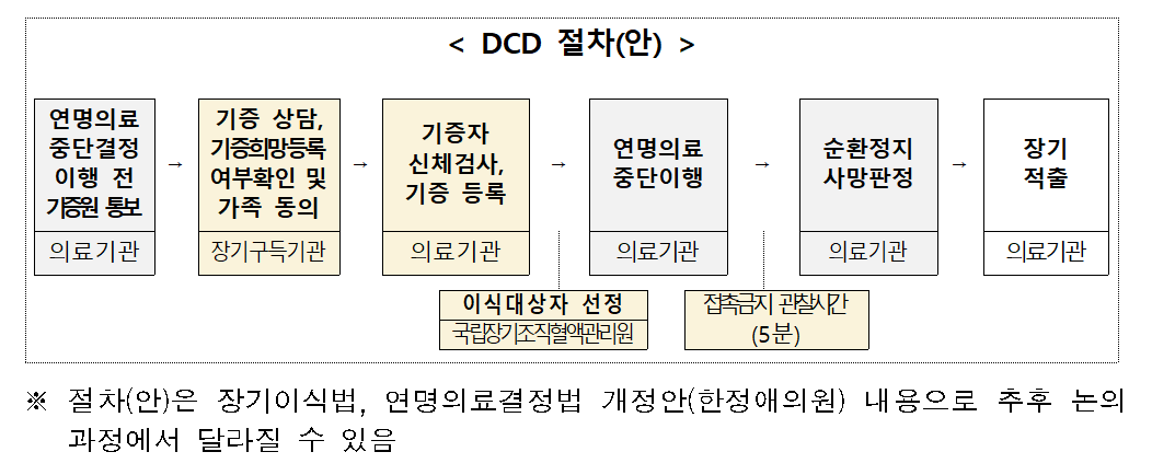 반면 우리나라는 아직 뇌사자 기증에 의존하고 있어, 장기의 수급에 한계가 있다. DCD는 이러한 한계를 보완하고 수급 불균형을 완화할 수 있는 새로운 대안으로 미국·영국 등 주요 국가에서는 이미 시행 중이며 우리나라도 이번 종합계획을 통해 도입을 추진한다.