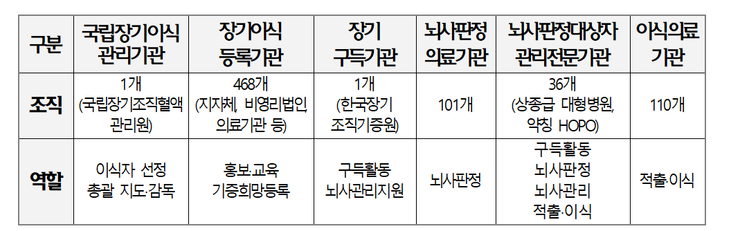 특히, 국립장기조직혈액관리원은 이식대상자 선정, 기증희망자 관리, 장기기증 등 홍보·교육 뿐만 아니라 혈액 안전관리 등 생명나눔을 총괄 관리하는 기관으로서 생명나눔 실천에 중추 역할을 담당하고 있다.