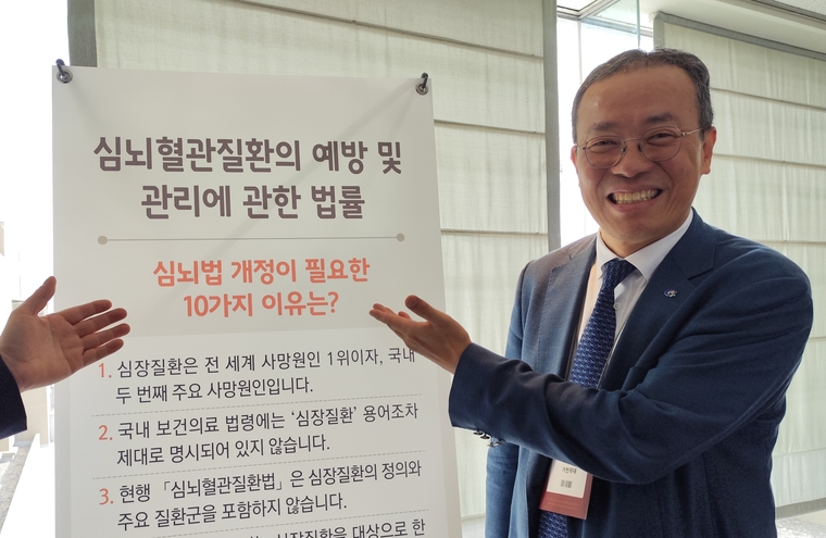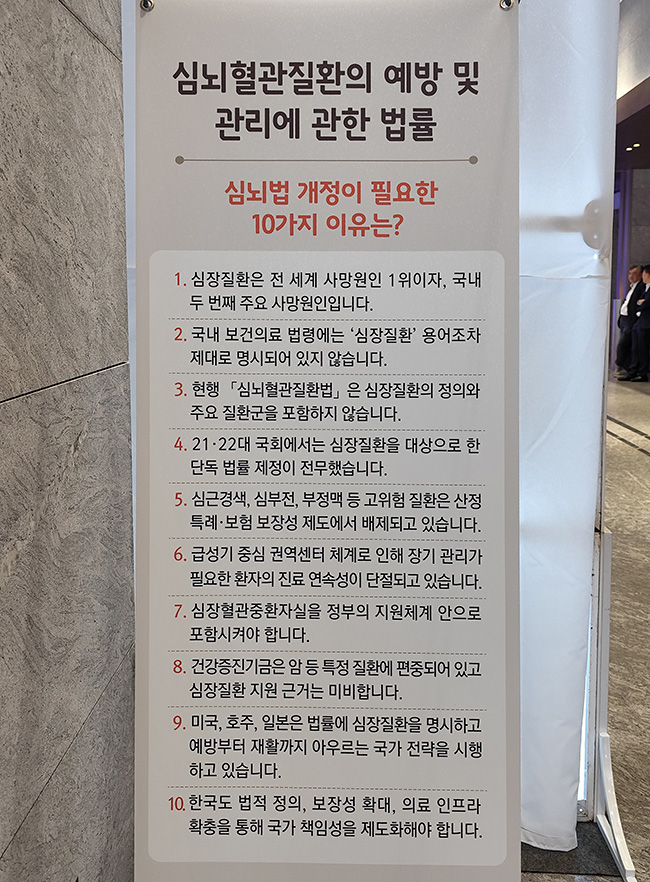 대한심장학회가 이례적으로 학술대회장 출입구마다 대형 배너를 세웠다. 제목은 다음과 같다. '심뇌혈관질환의 예방 및 관리에 관한 법률(심뇌법) 개정이 필요한 10가지 이유'. 단순한 홍보물이 아니라, 학회가 공식적으로 내건 정책 요구문이자 청구서다.