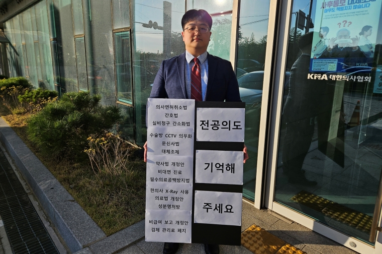 한편, 이날 의협 회관 입구에선 전공의의 1인 시위가 벌어졌다. 이 같은 의료 현안으로 자칫 전공의에 대한 의료계 관심이 부족해질 수 있다는 우려에서다. 향후 정책 및 집행부 방향 결정 시 전공의 입장도 헤아려 달라는 요구다.