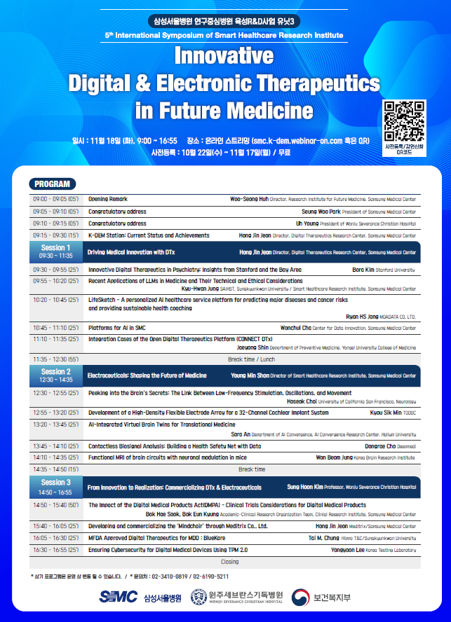 삼성서울병원 스마트헬스케어연구소(소장 손영민 신경과 교수)와 디지털치료연구센터(센터장 전홍진 정신건강의학과 교수)는 오는 11월 18일 오전 9시부터 온라인으로 제 5회 국제심포지엄을 개최한다고 밝혔다.