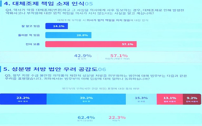 그 결과 성분명 처방과 대체조제 제도에 대한 국민의 인지도와 실제 이해도 사이에 뚜렷한 격차가 존재하는 것으로 나타났다. 실제 국민 절반에 가까운 44.5%는 현재 국회에 계류 중인 성분명 처방 법안에 대해 전혀 모른다고 답했다. 잘 알고 있다는 응답은 15.4%에 불과했다.