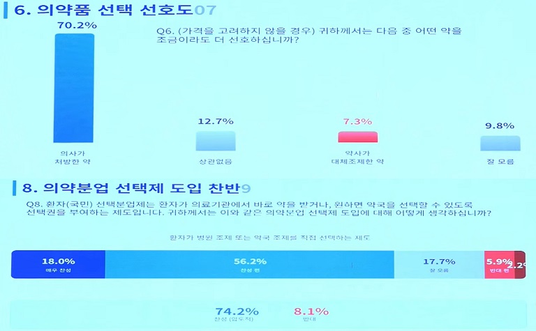 특히 성분명 처방 도입 근거인 감염병 대유행이나 약 품절 사태 등 위기 상황에서도 의사가 직접 약을 조제하는 '원내 조제'를 원한다는 응답이 70%로 압도적이었다. 나아가 환자가 병원 조제와 약국 조제 중 원하는 곳을 선택할 수 있도록 하자는 내용의 '의약분업 선택제'에 74.2%가 찬성했다.