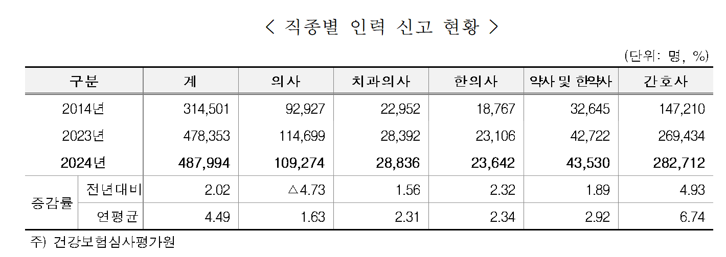 2024년 말 직종별 인력 전년 대비 증감률은 간호사 4.9%, 한의사 2.3%, 약사 및 한약사 1.9%, 치과의사 1.6% 순으로 증가했으며, 의사는 4.7% 감소했다.