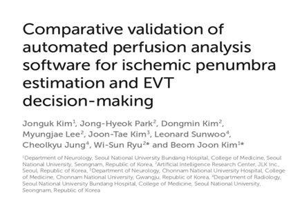 논문에서는 뇌 손상 정도(뇌경색 코어), 혈액 공급이 저하된 영역(저관류), 두 영역의 볼륨 차이(미스매치)를 비교한 모든 지표에서 제이엘케이 솔루션과 RAPID AI와 높은 수준의 일치도를 보였다.