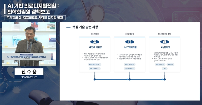 이어진 발제에서 카카오헬스케어 신수용 상무는 정밀의료 데이터 현황과 과제를 짚었다. 국내 정밀의료 기술과 정책이 빠르게 발전하고 있지만, 데이터 단절 현상과 병원 내 인프라 부족으로 인해 현장 적용에는 한계가 있다는 비판이다.
