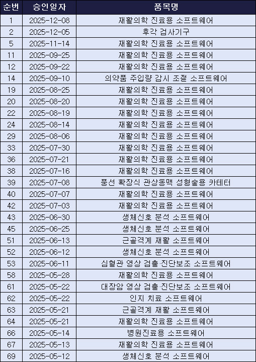 특히 2025년 승인 사례에서는 재활의학 분야의 비중이 두드러졌는데, 관절치환술 환자의 기능적 이동성을 평가하거나 수술 후 회복 경과를 정량화하는 재활지원 소프트웨어가 연속적으로 임상에 진입했다. 기존에 치료사 경험에 의존하던 평가를 알고리즘 기반의 측정값으로 치환하는 흐름이 가속화된 셈이다.