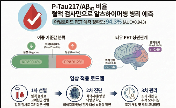 분석 결과, 완전 자동화 면역측정 플랫폼 통해 측정한 혈장 p-tau217/Aβ42 비율은 뇌 아밀로이드 PET 검사의 양성 여부를 예측하는 데 있어 약 94%의 매우 높은 정확도를 보였다. 진단이 불확실한 회색 지대에 속하는 환자 비율도 8%에 불과해 임상 현장에서의 활용 가능성을 높였다.