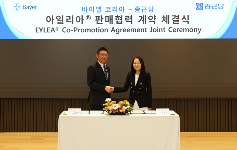 16일 바이엘코리아와 종근당은 망막 질환 치료제 '아일리아(애플리버셉트)'의 국내 유통 및 판매 계약을 체결했다.