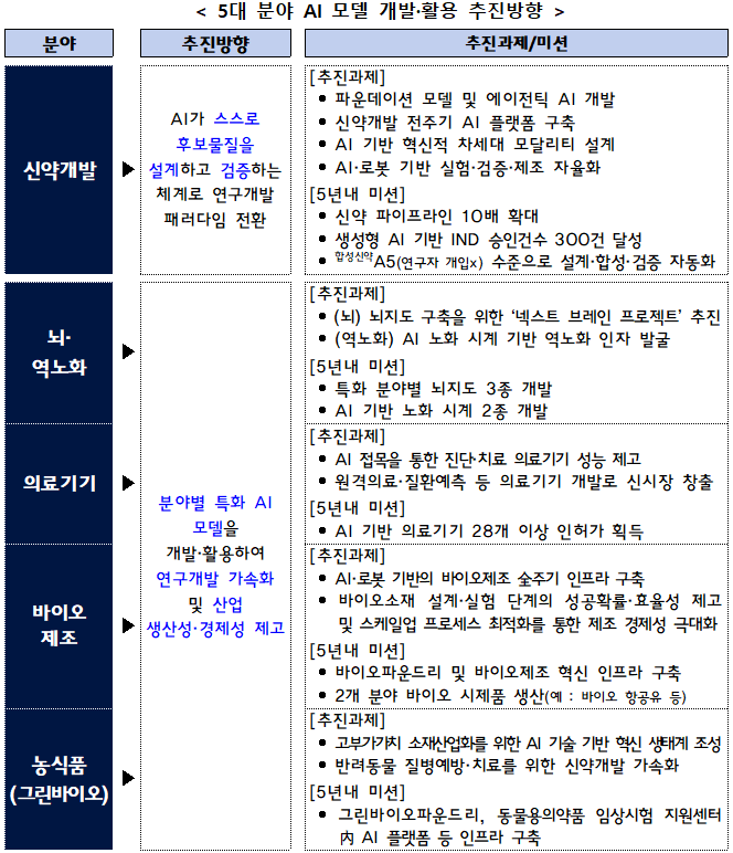 이 밖의 뇌·역노화, 의료기기, 바이오제조, 농식품(그린바이오) 분야의 경우, 각각의 특성을 고려한 특화 AI 모델을 개발·활용해 연구개발을 가속화하고, 산업 생산성·경제성을 제고한다.
