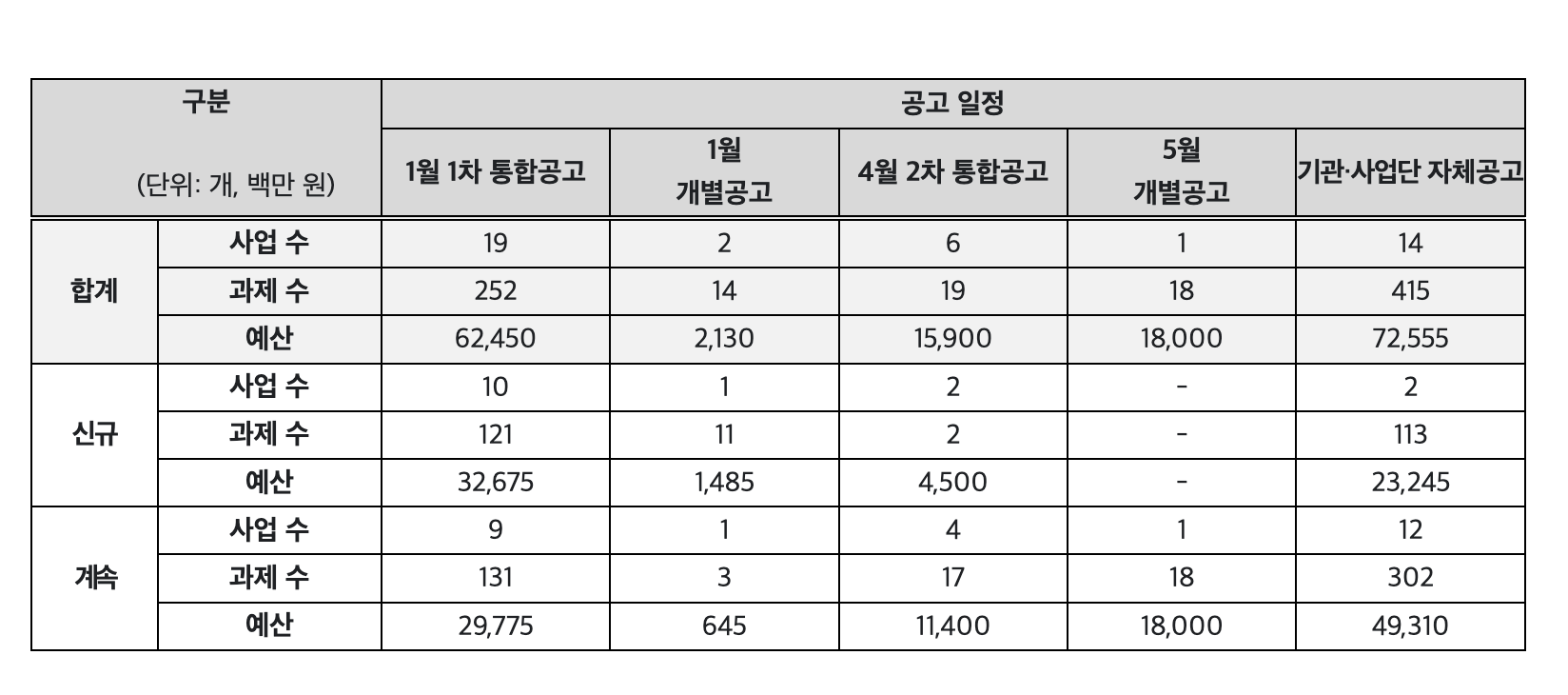 이번 제1차 통합 공고는 19개 사업(252개 과제, 625억 원)을 대상으로 한다. 공고는 2025년 12월 31일(수)부터 2026년 1월 30일(금) 14시까지 30일간 진행되며, 4월 중 연구개발기관을 선정하고 연구를 개시한다.