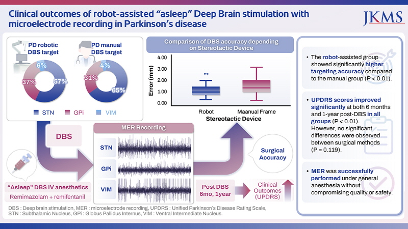 2일 대한의학회 국제학술지 JKMS에는 로봇 보조 수면 DBS 시스템을 한국 환자에게 직접 적용한 임상시험 결과가 공개됐다(10.3346/jkms.2025.40.e256).