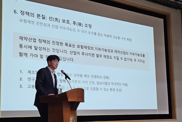 박준섭 이사는 "제약산업 정책의 진정한 목표는 보험재정의 지속가능성과 제약산업의 지속가능성을 동시에 달성하는 것"이라며 "산업이 무너지면 결국 재정도 지킬 수 없기에, 두 가지는 함께 가야 할 하나의 길"이라고 언급했다.