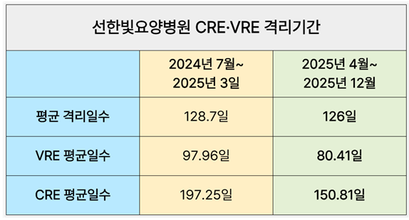 28일 선한빛요양병원에 따르면 격리실 감염관리 지표 분석 결과, CRE(카바페넴 내성 장내세균속균) 및 VRE(반코마이신 내성 장알균) 격리실 입원환자의 평균 격리기간이 지속적으로 감소했다.