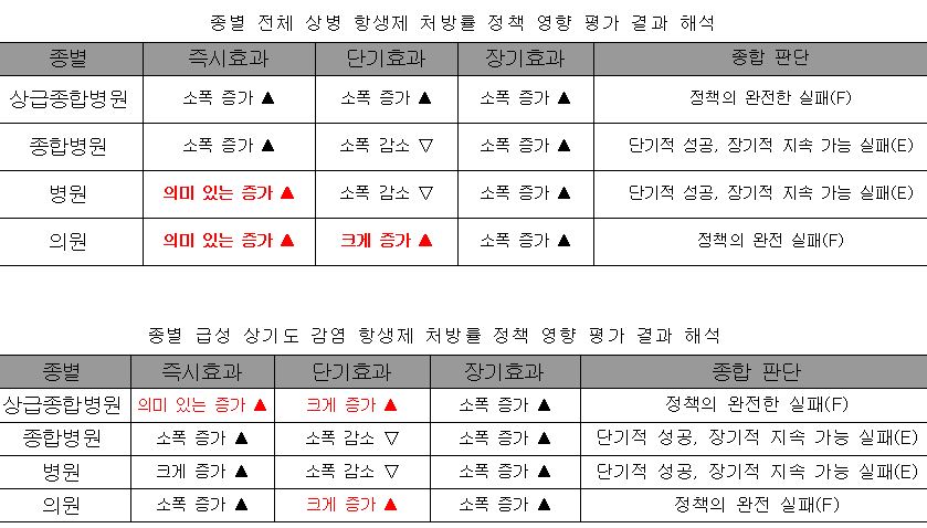종별 분석에서도 상급종합병원과 의원은 즉시·단기·장기 효과 모두에서 항생제 처방이 증가해 '완전한 실패' 판정을 받았으며, 종합병원과 병원 역시 단기적인 성공 뒤 장기적으로는 실패한 것으로 평가됐다.