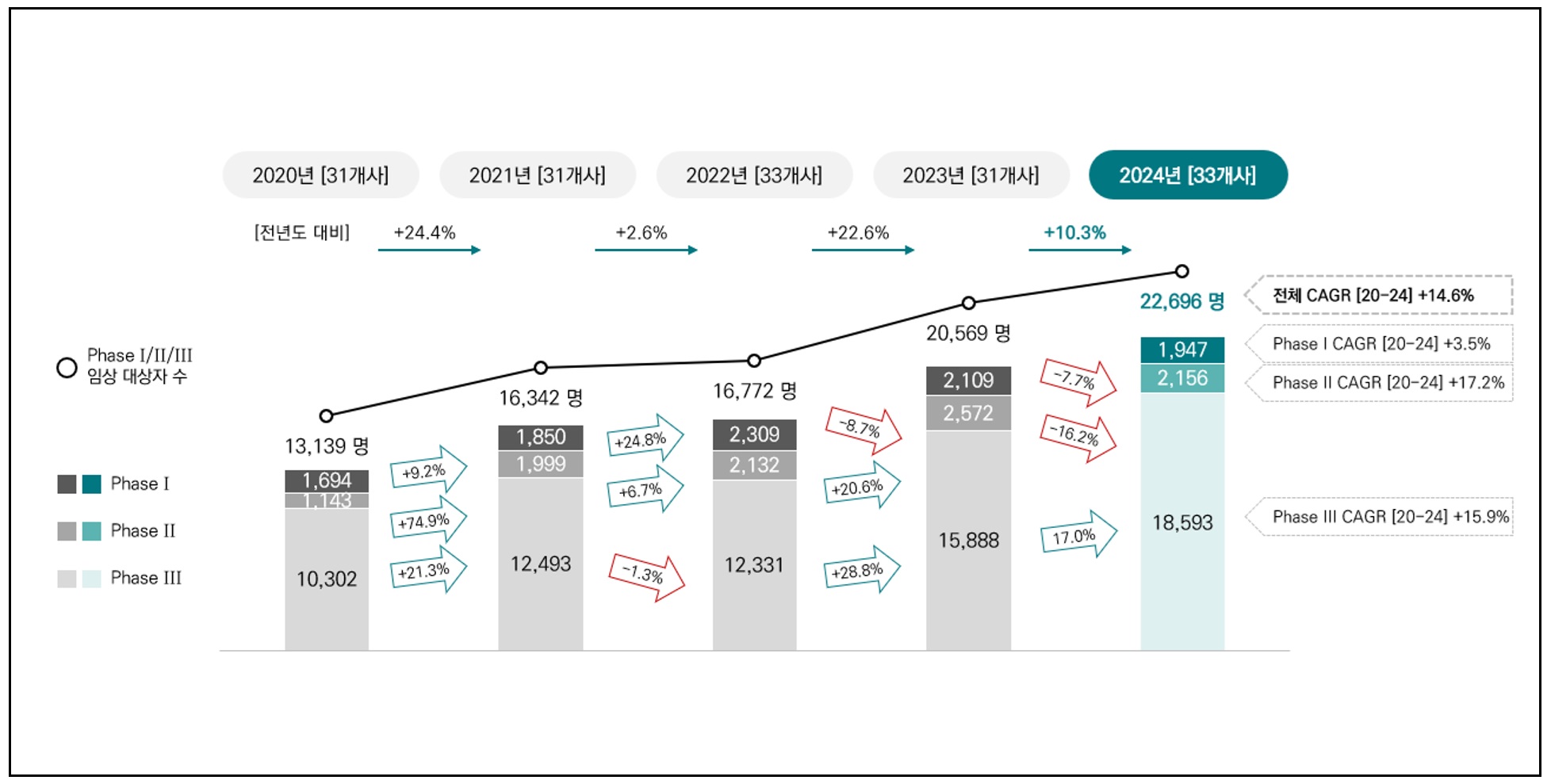 특히 2024년 들어 총 임상 건수가 감소세(-1.9%)로 돌아선 지점은 시사하는 바가 크다.