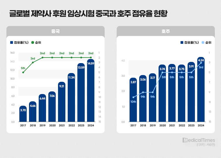 여기에 '초기 임상의 강자'로 군림하던 한국의 빈자리를 노리는 호주의 기세도 무섭다. 2017년 2.87%(10위)에 불과했던 호주의 점유율은 2024년 4.24%를 기록하며 단숨에 세계 3위까지 치고 올라왔다. 중국이 양적·질적 표준을 장악하는 사이, 호주는 파격적인 규제 완화를 앞세워 한국이 자랑하던 초기 임상 물량을 빠르게 흡수하고 있는 것이다.