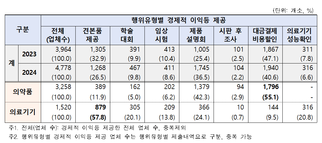 제공한 경제적 이익 규모는 금액 기준 8427억원, 제품 기준 2326만개로 2차 조사 결과 확인된 8182억원, 2119만개 제품 제공 대비 소폭 증가했다.