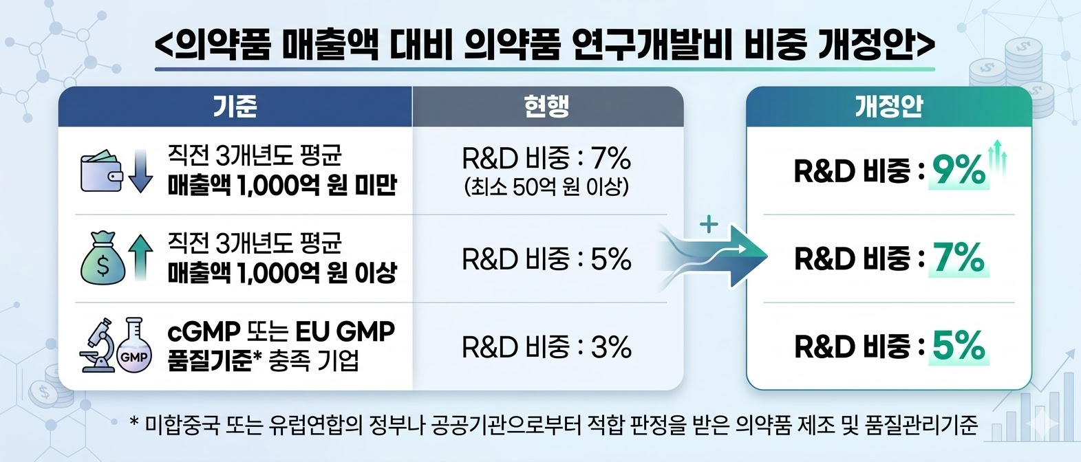 이번 개편안에 따르면, 혁신형 제약기업의 지속적인 R&D 투자를 이끌어내기 위해 인증 요건 중 하나인 '의약품 매출액 대비 연구개발비 비율' 기준을 현행보다 2%p 상향한다.