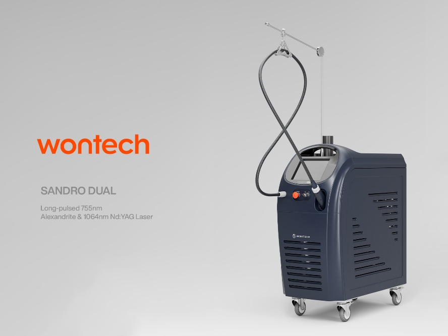 산드로 듀얼은 755nm와 1064nm 두 파장을 동시에 구현하는 복합 레이저로, 두 파장을 짧은 시간차로 연속 조사하는 '하이브리드 모드'를 통해 적은 에너지로도 목표 부위에 정밀한 에너지 전달이 가능하다. 자체 쿨링 시스템으로 통증·붓기·홍반 등 시술 부작용도 최소화했다.