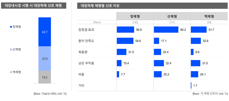 반면 산제형은 '장정결 효과'가 80.2%로 가장 큰 선호 이유였고, 액제형은 '장정결 효과' 외에 '환자 만족도'와 '낮은 부작용'도 선호 이유로 일부 작용한 것으로 확인됐다.